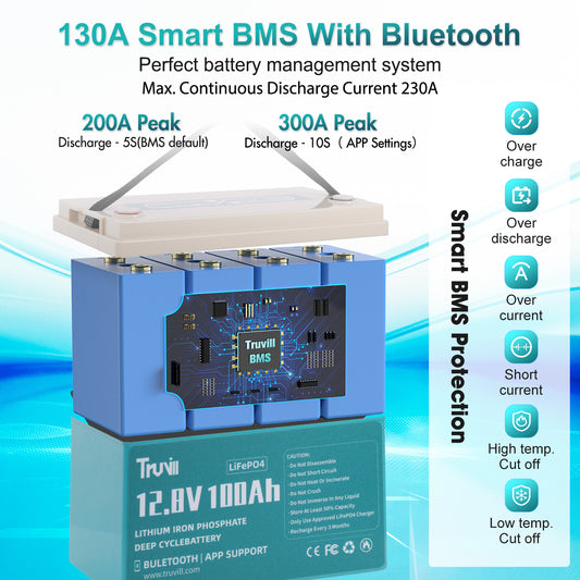 Truvill 12V 100Ah Lithium Batteries Bulit-in 130A Smart BMS LiFePO4 Battery 8000+ Deep Cycle Battery with Battery Monitor Auto/Manual Battery Balancer for RV, Solar, Marine, Camping