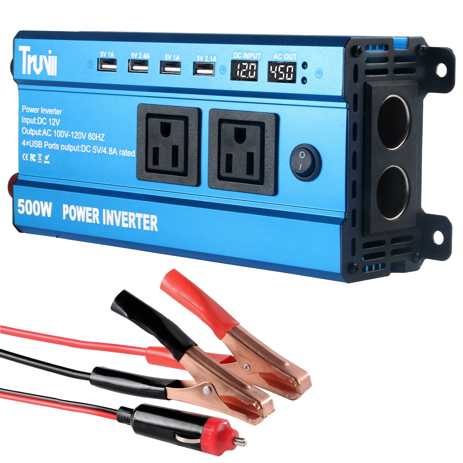 - 【500W CAR POWER INVERTER]】Truvill Car power converter featured with 2 standard AC sockets 3 USB charging ports and QC 3.0 fast charge. This DC 12V to AC 110V converter provides power up to 500W great for charging laptop, tablets, cell phone, Christmas gift,string lights, breast pump, CPAP machine, nebulizer, game console, kindle, TV, DVD players, lights, iPad, and other electronic devices