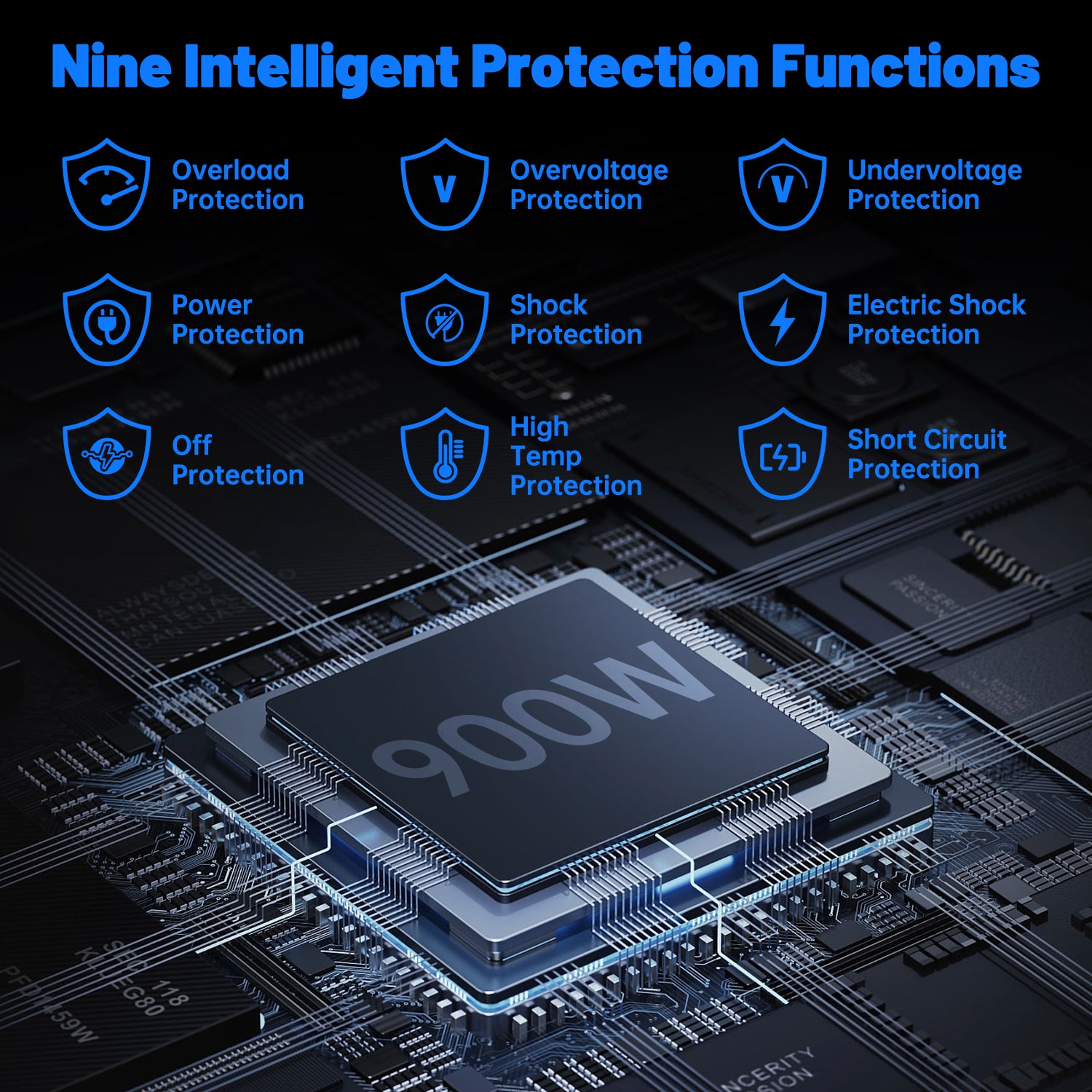 - 【MULTI-PROTECTION 】Built-in nine protection system provides full-protection with Overload Protection, Overvoltage Protection, Undervoltage Protection,Power Protection, Shock Protection, Electric Shock Protection,Off Protection, High Temp. Protection, Short Circuit Protection