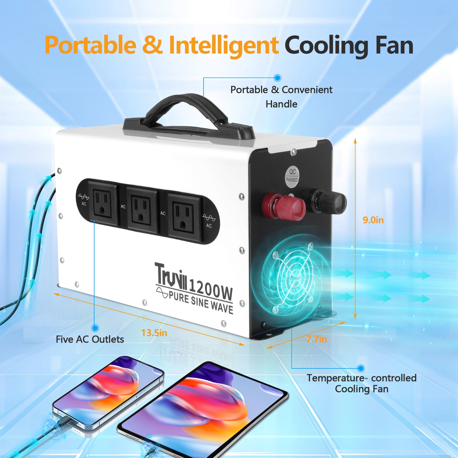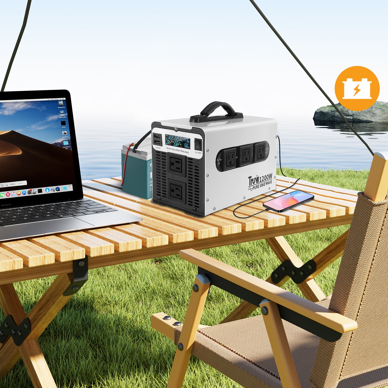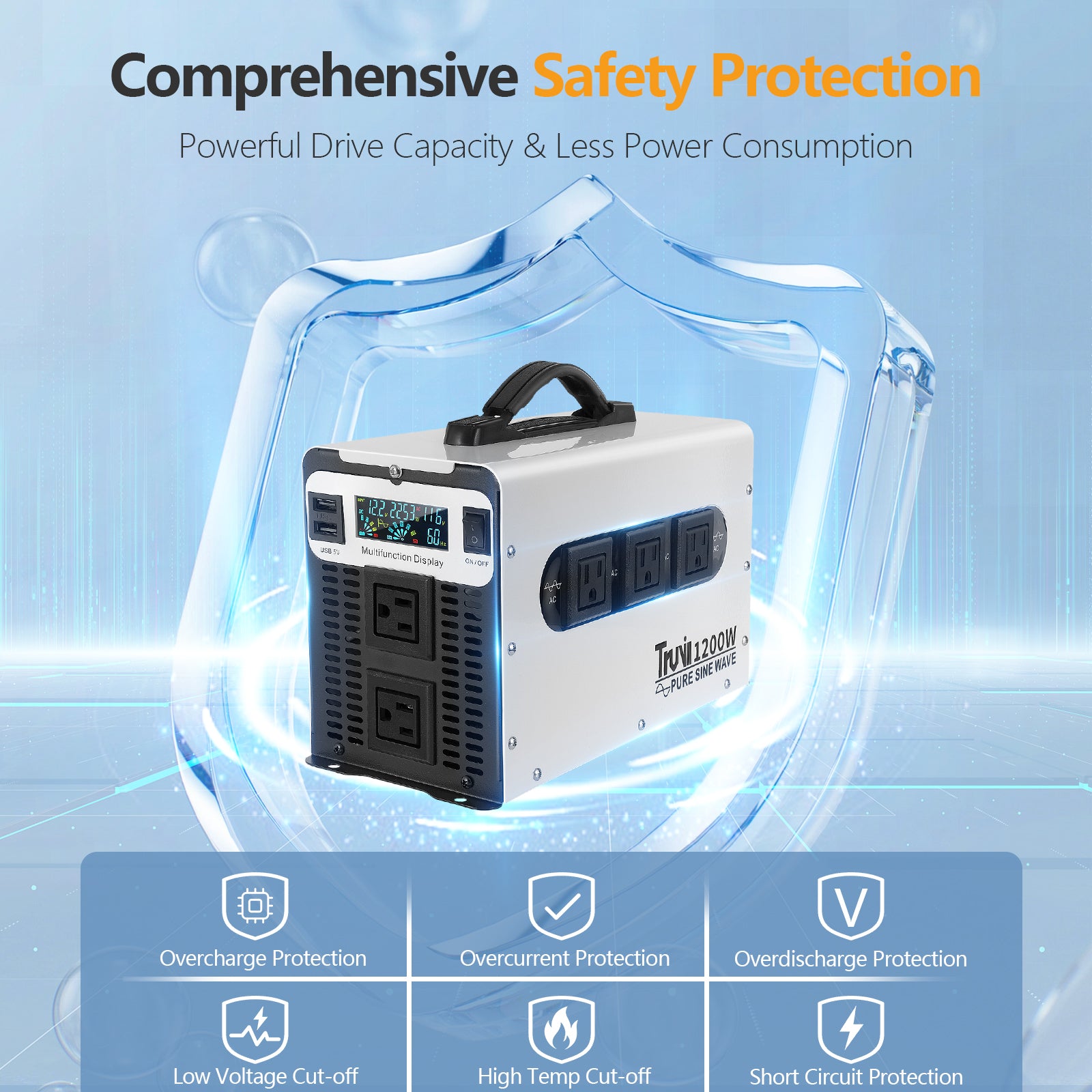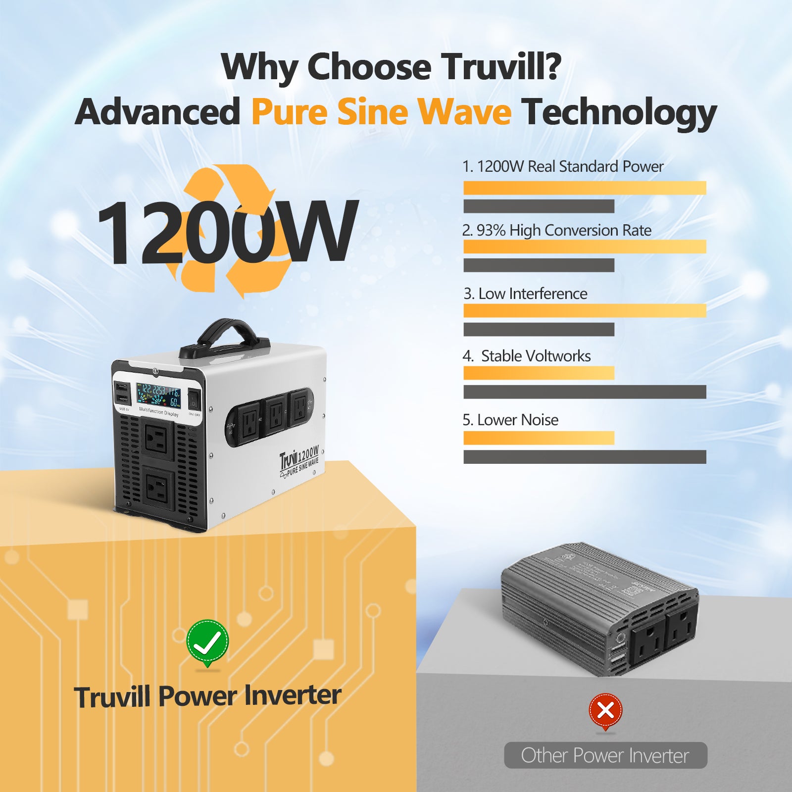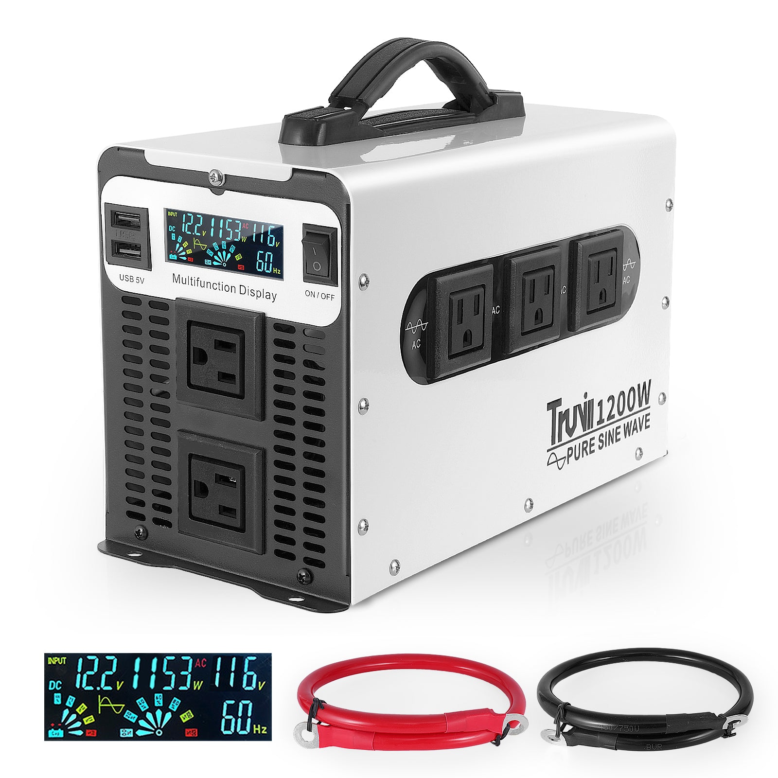 Truvill 1200W Pure Sine Wave Inverter 12V DC to 110V 120V Power Inverter with LED Monitor Solar Inverter for Home RV Truck Off-Grid 12V Inverter Built-in USB Five AC Hardwire Port