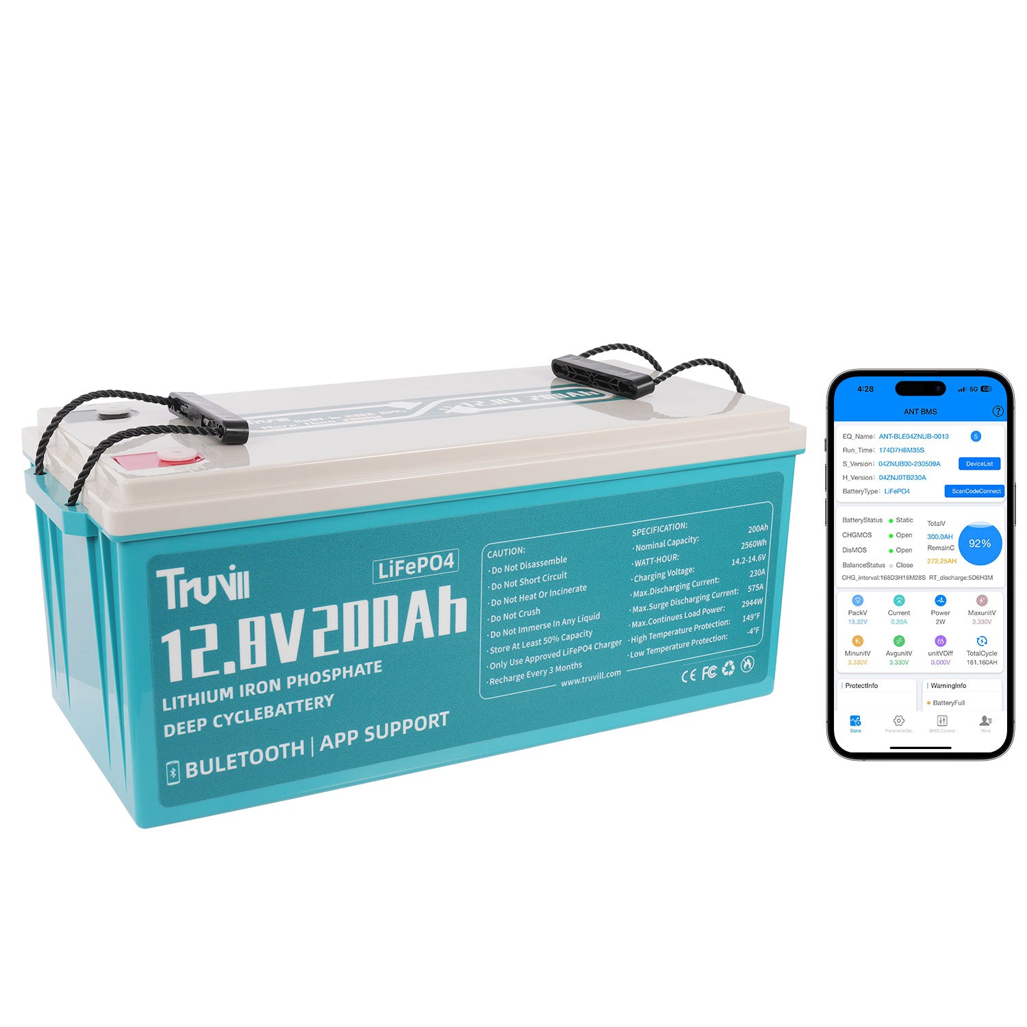 - 【Real Time Battery Monitor】Smart Bluetooth battery system helps you better understand your energy status, real-time monitoring of your battery data, so that you are not afraid of energy anxiety, reasonable arrangement of energy use. Whether you use it as marine battery, RV battery, or solar battery and so on, Truvill helps you no more energy worries.